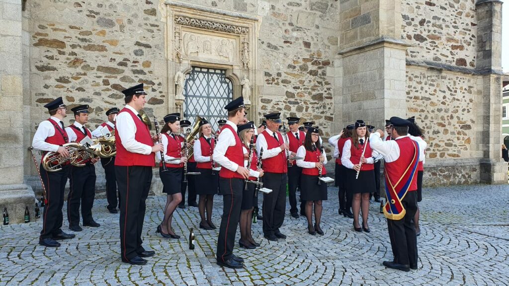 Traditionell führte die Stadtkapelle Eferding den Festumzug zur Erstkommunion an. Wie gewohnt nahm man vor dem ehemaligen Stadtsaal Aufstellung und führte die hohe Geistlichkeit sowie zahlreiche Erstkommunionkinder, deren Pat:innen und Angehörige mit musikalischen Klängen zur Kirche.