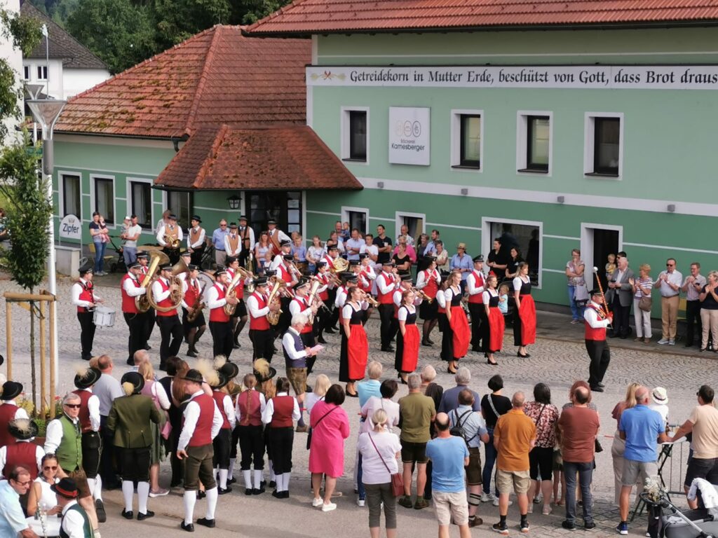 Nachdem auch die fünf Gastkapellen einmarschiert sind, nahmen wir Aufstellung für den Festakt und gratulierten so dem Musikverein St. Marienkirchen zum Geburtstag. Im Anschluss fand ein kurzer Festzug zum Veranstaltungszentrum statt, wo wir unseren Sieg ausgiebig feierten. Die Mostpressers heizten allen erfolgreichen Musiker:innen zu den ohnehin warmen Temperaturen nochmals ordentlich ein.
