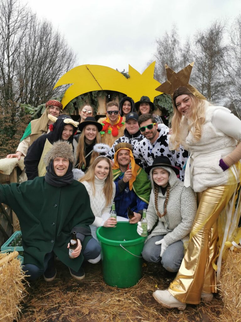 Nach den gemeinsamen Vorbereitungsarbeiten am Faschingswagen konnten etwa 15 Hirten, Könige, Engel und Stallbewohner des Musikvereins daraufhin die tolle Stimmung am Wagen in Alkoven genießen.