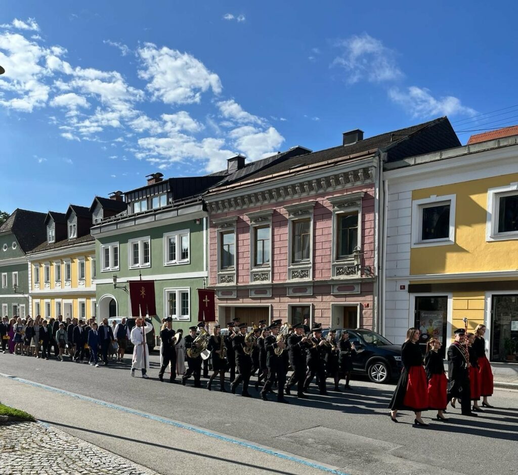 Gemeinsam stellten wir uns beim Brunnen vor dem Schloss Starhemberg auf, um dann gemeinsam zur Kirche zu marschieren. Für uns die perfekte Gelegenheit die Wertungsmärsche und Schwenkungen sowie die „große Wende“ zu üben – für die Firmlinge und ihre Familien ein feierlicher Start des Festtages.