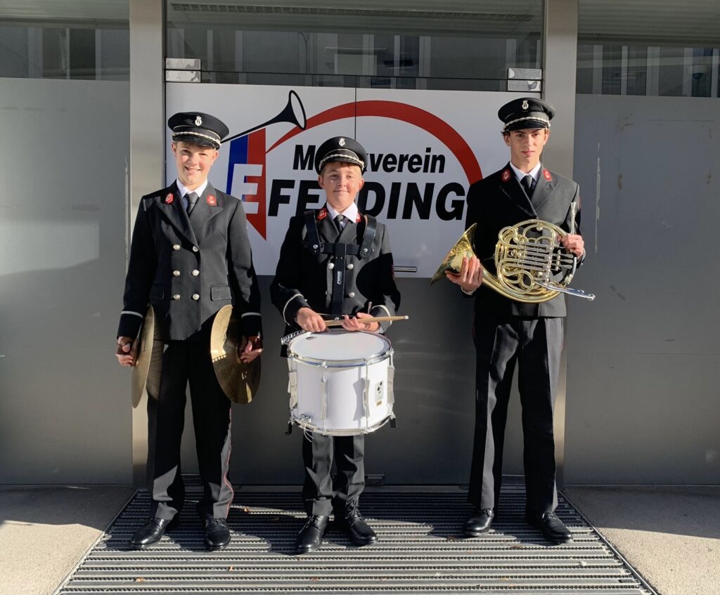 Für drei junge Musiker war es der erste Auftritt in ihrer neuen Uniform: Lorenz Weinmann (Waldhorn), Sebastian Schleindl und Theodor Baier (beide Schlagwerk) durften das erste Mal mit den Großen mitmarschieren. Augenzeugenberichten zufolge haben sie sich bei dieser Feuertaufe sehr gut geschlagen! 🙂