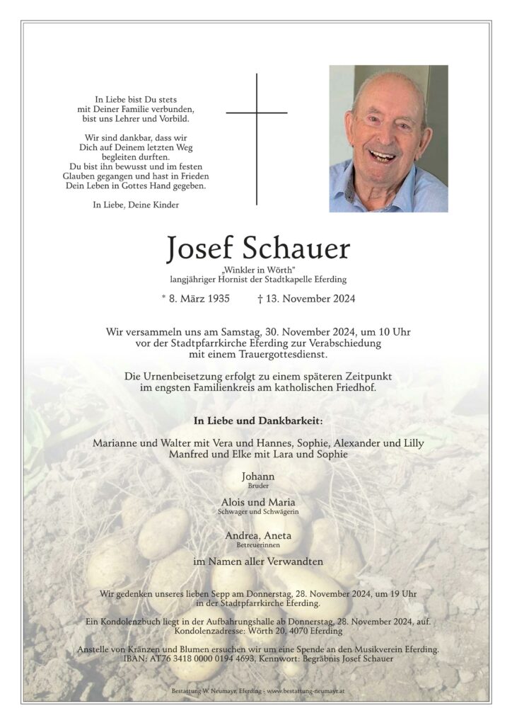 Am 30. November 2024 mussten wir einen sehr geschätzten und beliebten Kameraden auf seinem letzten Weg begleiten. Unser ehemaliger Hornist Josef Schauer starb am 13. November im 90. Lebensjahr.