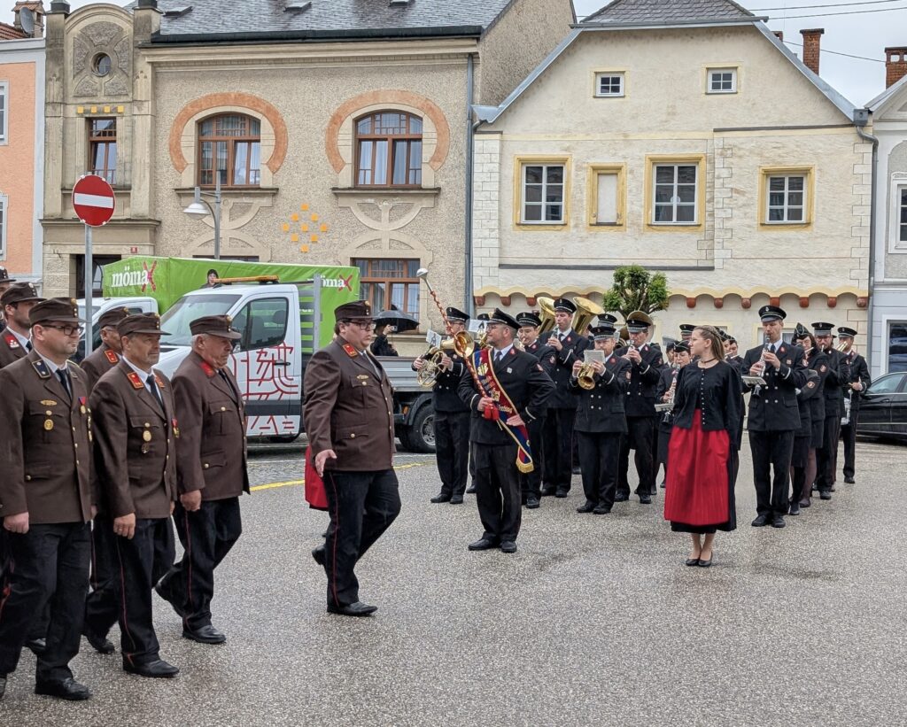 Da nach der Messe der ausgiebige Regen sich auf ein leichtes Nieseln reduzierte, konnte die anstehende Defilierung am Stadtplatz wie geplant gemacht werden, bei der sich die Freiwilligen Feuerwehren gut präsentierten. Die Musikkapelle spielte dazu die Märsche „Rechts schaut!“ und den „47er-Regimentsmarsch“.