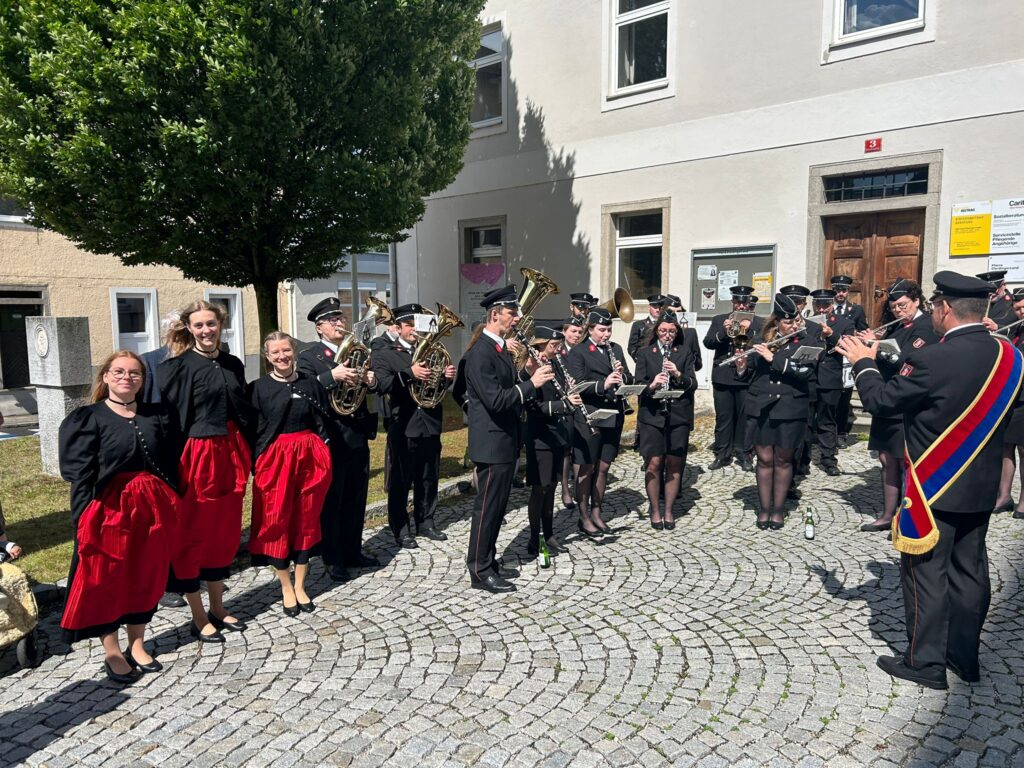 Um 08:50 Uhr marschierten wir gemeinsam mit allen Festgästen im Rahmen einer Prozession zur Stadtpfarrkirche Eferding und freuten uns, dass wir trocken blieben. Während des Festgottesdienstes regnete es und pünktlich zum Ende des Gottesdienstes bzw. zum Umzug um die Kirche präsentierte sich die Sonne. Während dem Erstkommunionsfrühstück spielten wir noch ein Standkonzert für alle Anwesenden, die dem Wind trotzten und sich auf die Sonnenplätze verteilten.